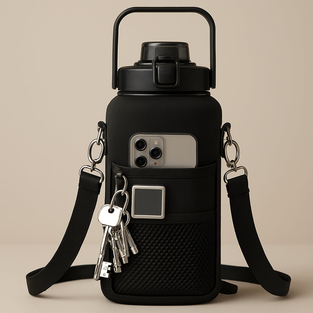 Capa de Neoprene: protege contra quedas, mantém a água gelada por mais tempo e ainda possui bolsos para celular, chaves e cartões.